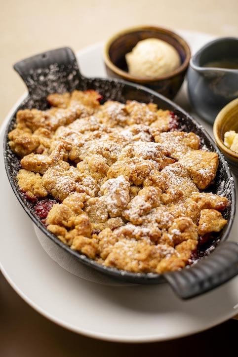 Apple and Plum Crumble Vanilla Anglaise Sauce