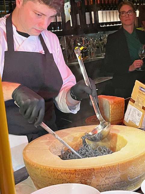 The pièce de resistance was Black Tagliolini Truffle on Grana Padano PDO Wheel, pasta tossed into a hollowed out cheese wheel before being served.  The perfect pairing was Prosecco DOC Cantina Colli Euganei, a structured, elegant wine from volcanic soil with enough depth to stand up to the truffle’s earthy aroma and the Grana Padano’s umami intensity. A classy pairing.
