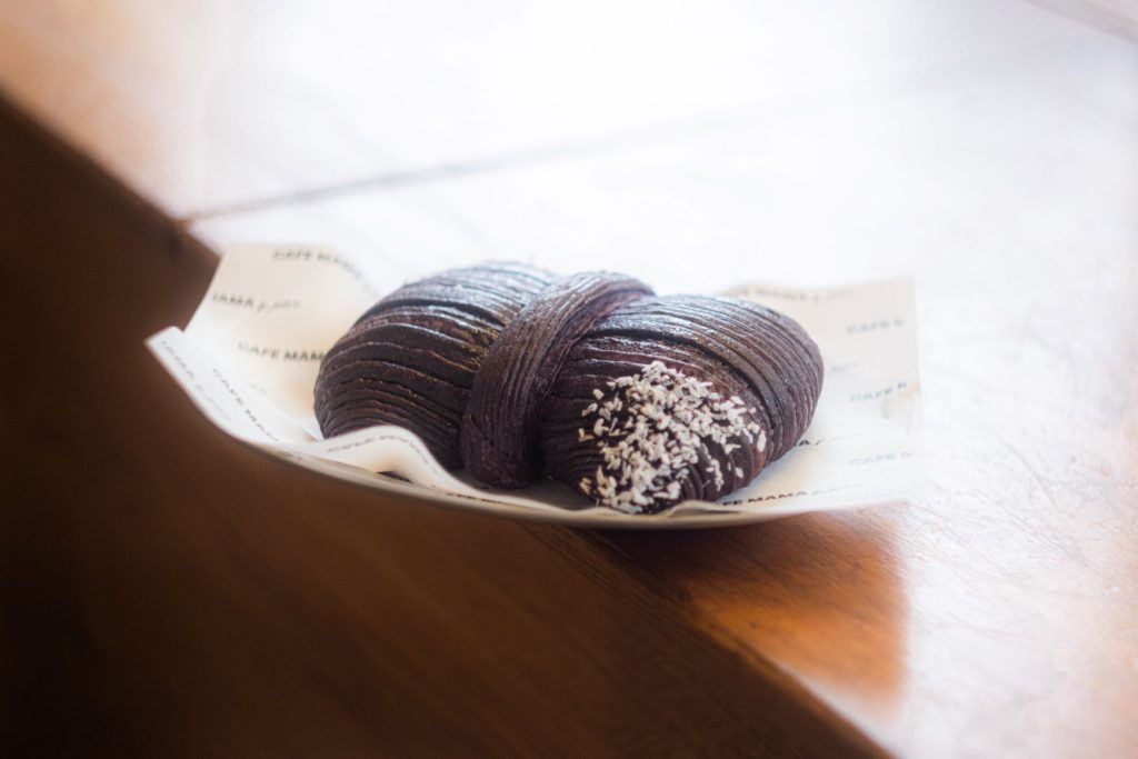 A delicate purple croissant shaped like a bow and filled with chewy ube mochi and ube cream – it is both adorable and delicious.