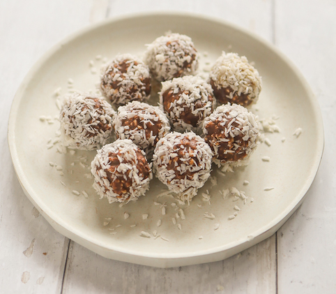 - Spread coconut flakes on a large plate. Using a small cookie dough scoop, drop balls of dough onto it, cover with coconut flakes (from the plate) and gently roll around a bit.