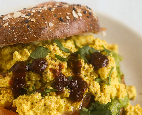 - Toast the bagels and spread half of the avocado on each bagel. Add the tomatoes and a pinch of salt to each bagel. Spoon on the tofu mixture and garnish with the dill and a drizzle of sriracha. Enjoy!