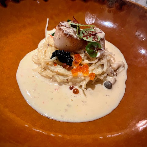 Dinner was upstairs and seated — properly seated — with everyone sharing the same space and the same courses, a quietly confident move that reinforced the restaurant’s emphasis on togetherness rather than theatrical table-hopping. The menu was reassuringly ambitious: seared scallops with cappellini in Ikuta cream and Avugra caviar to start was excellent.