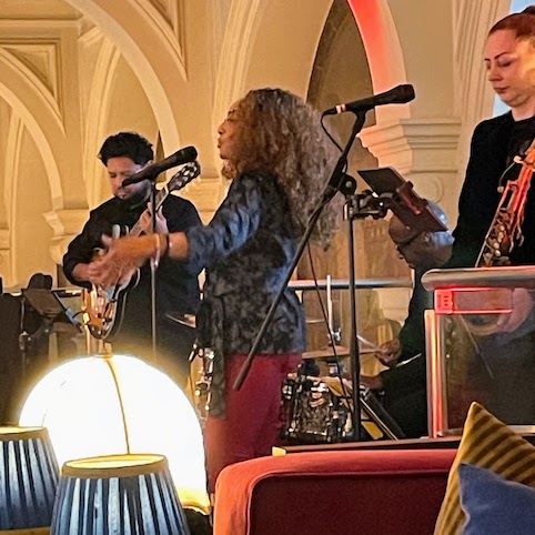 She’s very good, the whole band is. The bar manager is finding it hard not to dance a bit as he moves about, and I can’t blame him as the bottomless fizz begins to kick in.