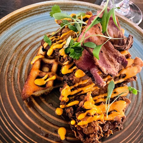 I am more brunch minded with Buttermilk Fried Chicken, waffle, crispy bacon, maple syrup and Sriracha mayo. It’s perfect chicken – crunchy outside, moist within and the waffle is crispy soft. The contrast of the Millennial Mayo with the smokey syrup is perfect, and I do love properly crispy bacon. I’m very happy with it all. It’s toe-tapping ‘tastic.