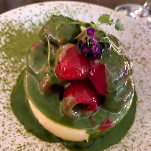 P goes very decadent with dessert – Black Forest Pancake – basically a  chocolate and cherry pancake, topped with whipped cream chocolate sauce. I’m a bit more restrained with a Matcha Cheesecake made with matcha on a crunchy biscuit base and topped off with a berry coulis and fresh raspberries, you could almost call it healthy.