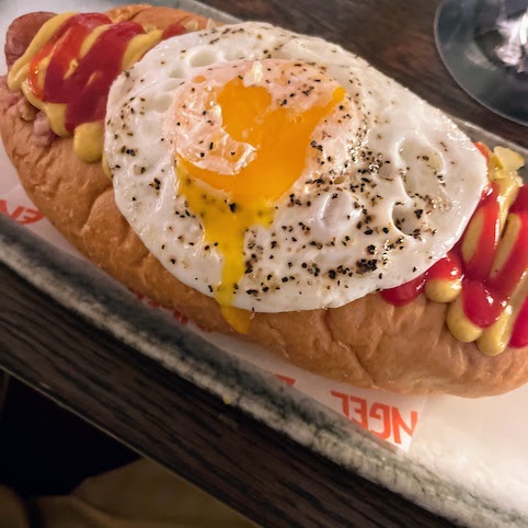 My technicolour Engel Breakfast Hot Dog ( vegetarian is available) sautéed mushroom and onion, crispy bacon, mustard, ketchup, fried egg, brioche, is absolutely brilliant. The sausage has a perfect ‘snap’ to the skin and tastes great on its own. The other ingredients are a bonus on top. I eat it with a knife and fork, which is perhaps not the right way but it does mean my trousers don’t have to go to the dry cleaners the next day.
