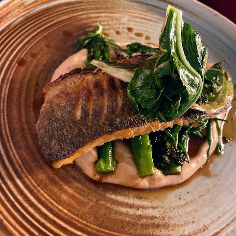 With the band now well into their groove P gets well into pan fried sea bass, cauliflower puree, charred cauliflower leaves, samphire, grilled broccoli, yuzu and soy glaze. It doesn’t sound very brunchy, but when it’s this good who cares? Excellent fish with crispy skin and packed full of flavours all the way through.