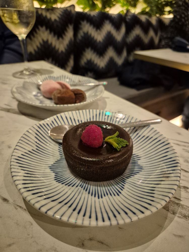 The sweets section is short but varied enough ice cream mochi, along yuzu of course and GF chocolate coolant. Glossy like a mirror, rich and dark, it practically melts on the tongue — the kind of dessert we happily linger over while the London storm rages outside.