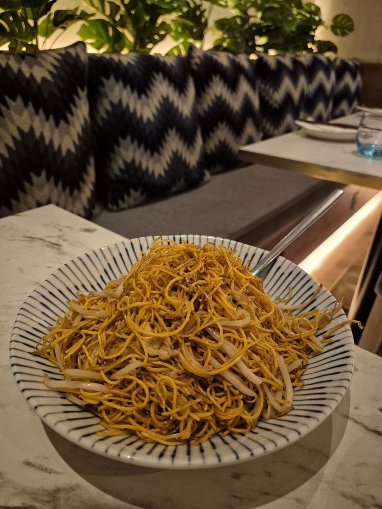 A large comforting plate heaped with Singapore vermicelli noodles, it’s a gluten free dish too.  The vermicelli come mixed with juicy chunks of chicken and jumbo prawns.
