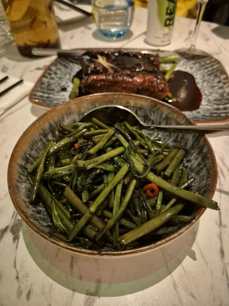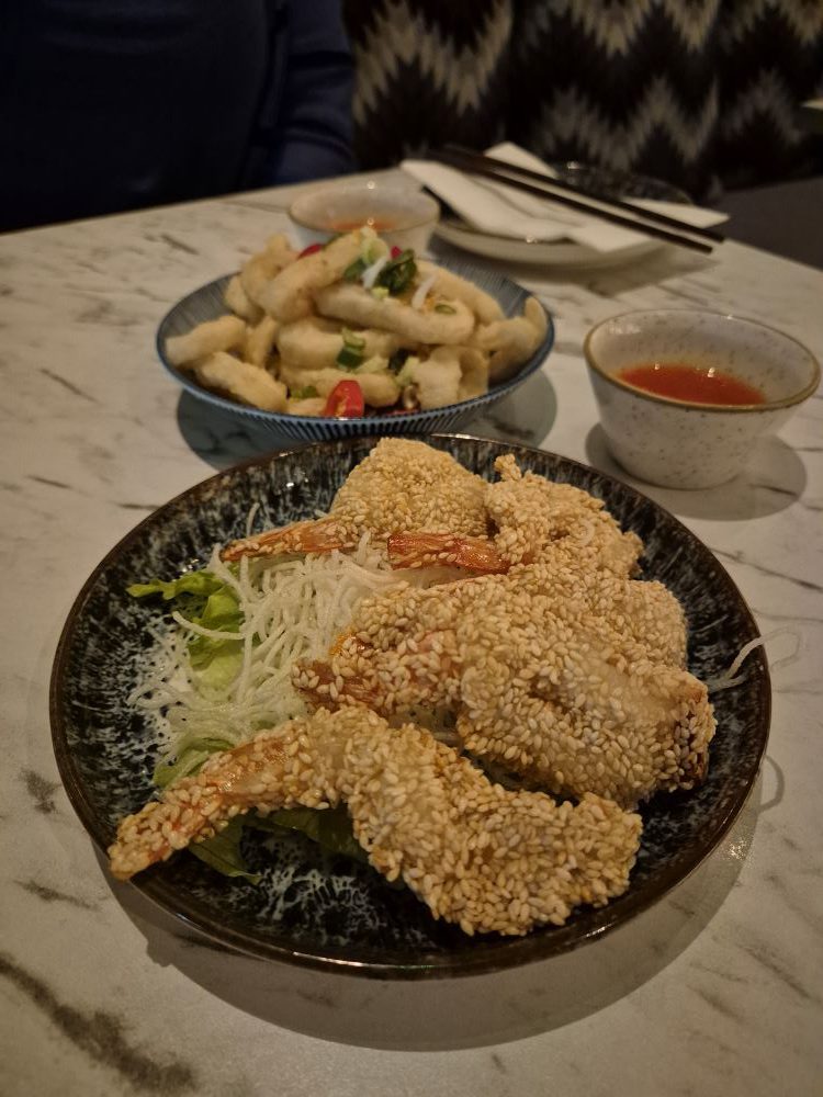 Perfectly balanced and distinctively floral, it sets the tone as we sip and bite on our starters. My sesame prawns are crisp and light, with just the right amount of oil.