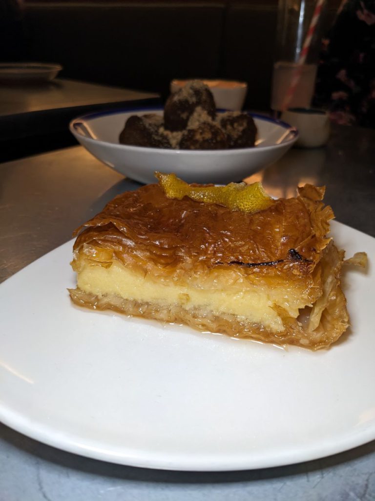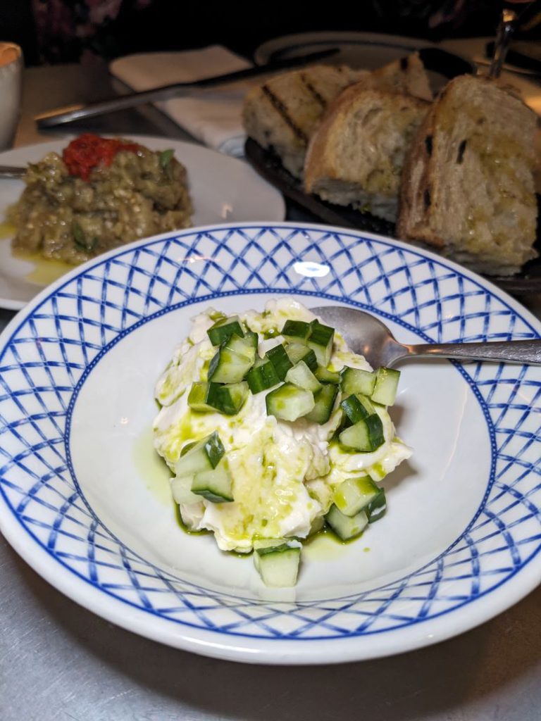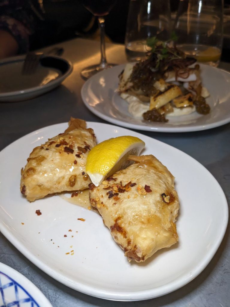 Tiropitakia — tiny filo cheese pies — are a treat. The chili in the honey is a little too spicy for me, but they’re perfect for dunking into the dips — a much better combo than sourdough bread in my book.