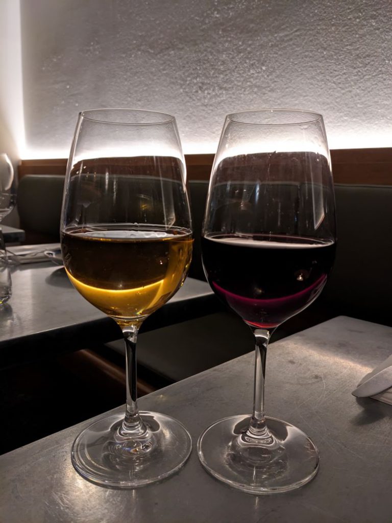 So we seek help from our waiter. After a short questionnaire we settle for Macedonian Oenops Apla red and Garalis Terra Ambera, a Muscat orange wine. Orange is always my preferred choice.