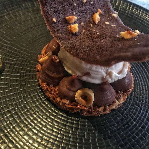And so to dessert. I’m a bit porked out but still enjoy my hazelnut and white chocolate praline with salted caramel ganache, served with banana ice cream, garnished with cocoa tuile and Vecchia Romagna jelly with golden leaf.