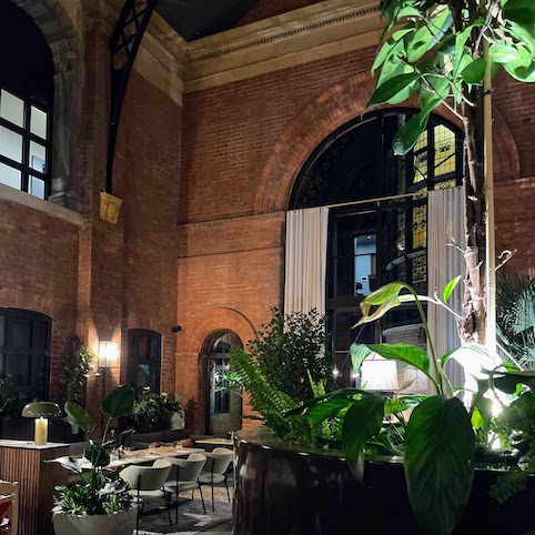 Not for me though, I was heading to the recently opened Oz & Isle all day restaurant. Heading through reception, past stained glass windows and the open air, you arrive in a wonderful large and soaring space, the old Drill Yard now with a vaulted ceiling of glass and enough greenery to make Monty Don wax lyrical. The bare brick of the walls, the low lighting and a mix of different size tables, along with some sofas, is very cosy and welcoming.