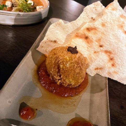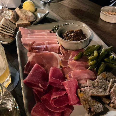 We paired it with a meat board of Lomo, Bresaola,  Mortadella, ham and a game terrine with toasted sourdough and pickles. All very well sourced and prettily presented. A pure vegetarian board is also on the menu.