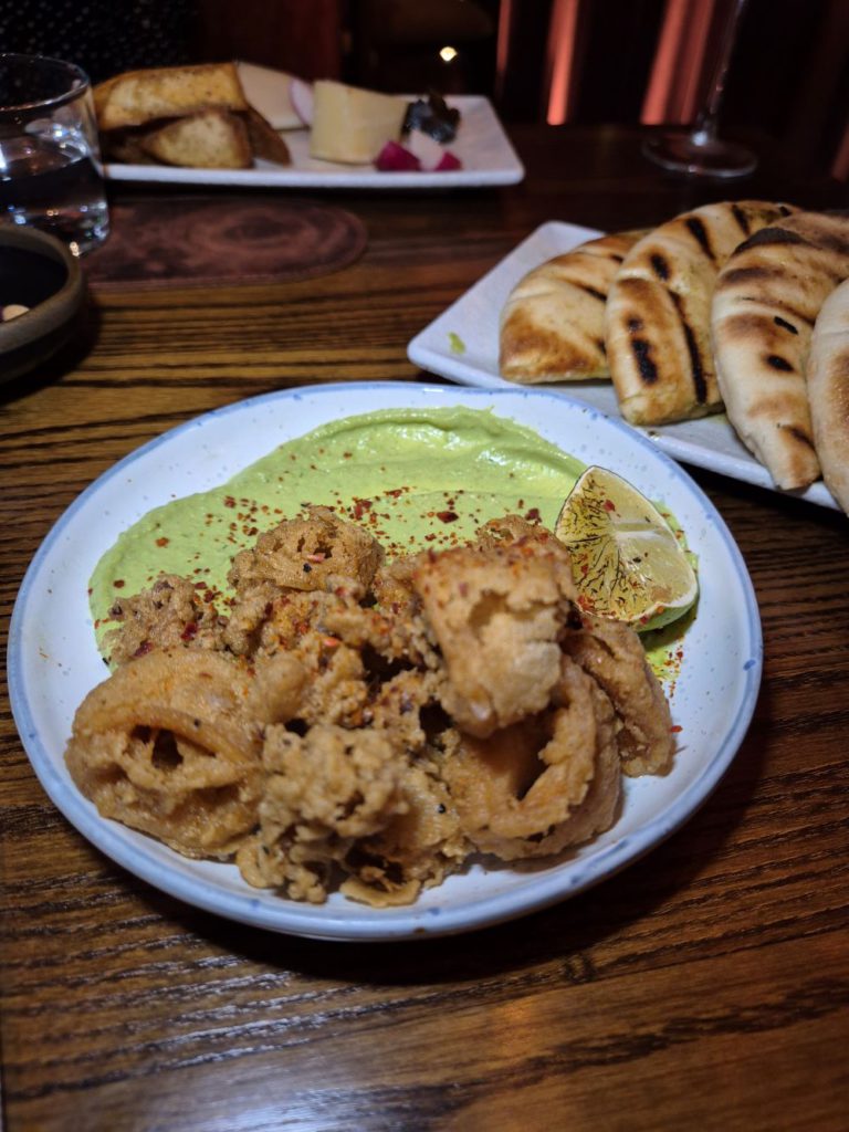 Baba ghanoush works well as a dip to the crispy calamari even. I mix and match between that and zhoug aioli, which is a vibrant green cilantro Middle Eastern condiment.