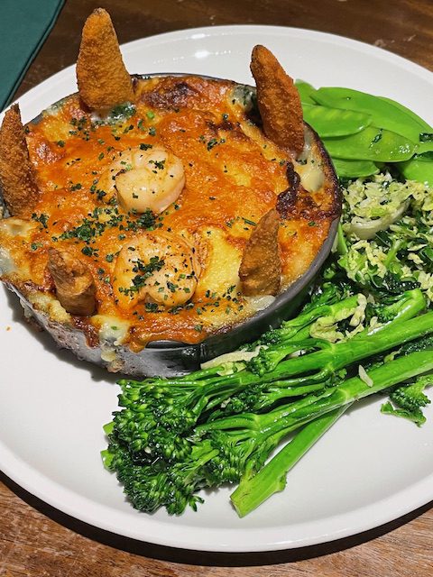 The Climping beach fish pie, grilled cheddar mash, buttered prawns and seasonal vegetables had swiftly been ‘bagged’ by my husband as he’d heard that it was a signature dish. He’s normally the one to choose a pie, but it was my turn this time – homemade steak and ale, chips and seasonal veg.