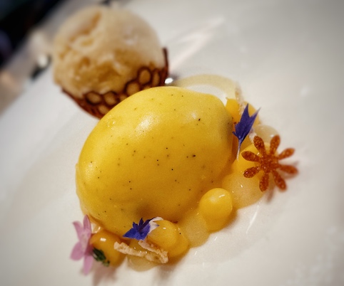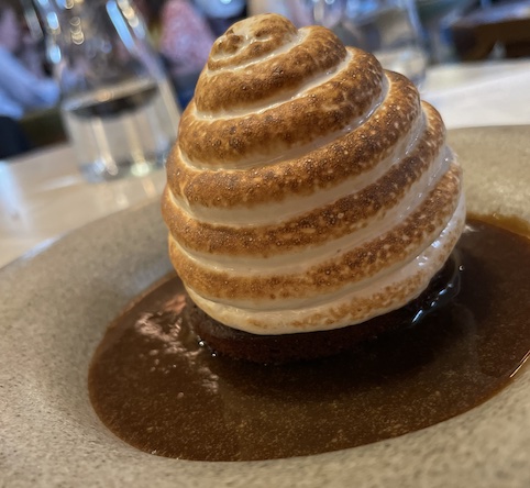 Cornish Monkfish, curried mussel velouté, crispy hen’s egg, pomme cocotte, leek was also very good. Curried mussels is a dish I came across in the Charente region of France, they use classic curry powder, not seen in the UK since the 1970s, and it really works well. It made me rather nostalgic for my mum’s curries which, looking back, were otherwise something of a disgrace.