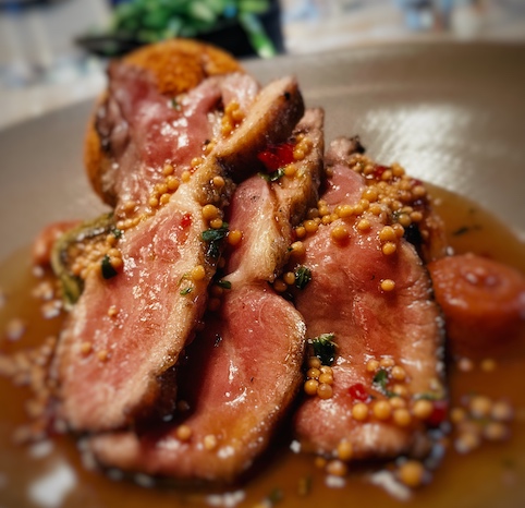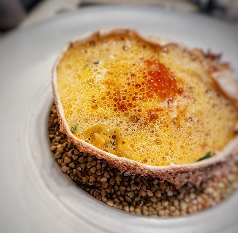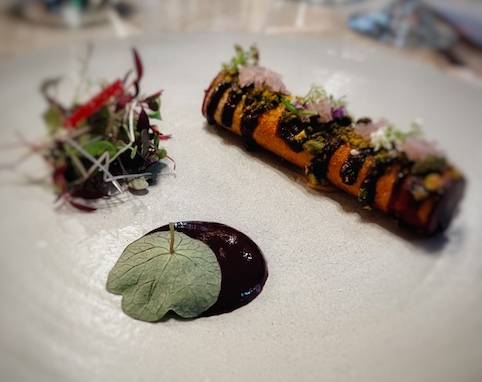 Starters proper gave us Spider Crab, squid ink hand-rolled pasta with Sauce Americaine, and a Smoked Devonshire Duck Parfait, potato cigar, pistachio, cherry. The crab was served in its shell, which was a good piece of plating. Very ‘crabby’, which was good and the Sauce Americaine, a classic French sauce for lobster, sang out beautifully. I didn’t see much black in the pasta, but it was well made