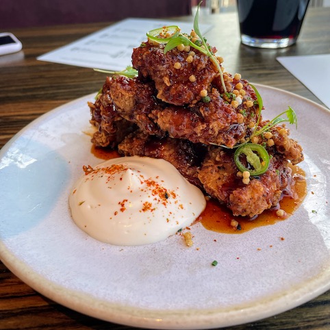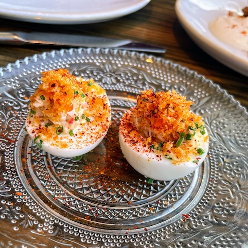 Love the chicken. It’s crispy outside, moist within and the glaze is brilliant. We should have eaten it last though, as the chili is a bit fierce and lingers over into the devilled eggs, which are deliciously delicate and get a bit of a battering from it.
