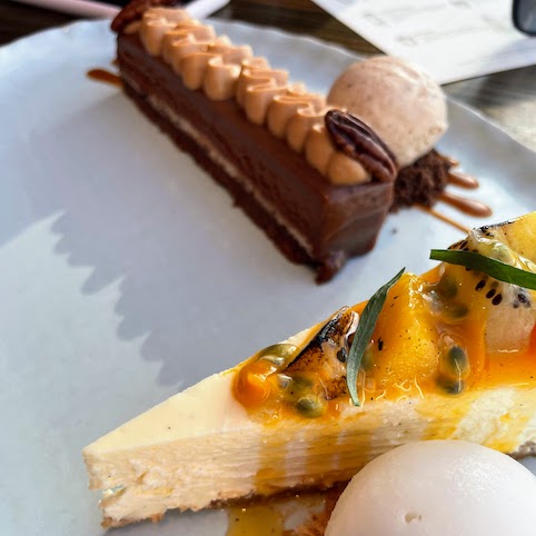 Dessert is as easy as starters, the pretty looking Oblix dessert platter gives three things to share. There’s chocolate fondant with salted caramel ice cream, a New York cheesecake with mango, coconut and passionfruit, and some vanilla ice cream on crushed nuts. All very tasty indeed, we’re soon scraping the slate.