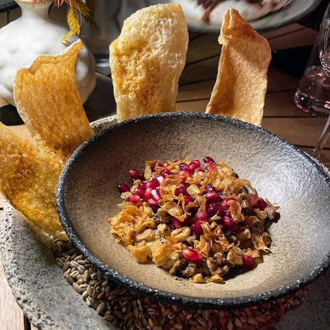 These pittas are fat and round and delicious and prove perfect for loading up with the creamy sheep’s milk labneh with pork and a smattering of chick peas. Superb, as is the smoked aubergine puree with roasted garlic, this time scooped up with perfect crispy tranches of crackling. A dusting of pomegranate seeds add colour, but do get caught in my teeth.