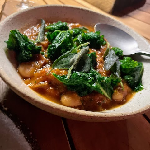 And from out of the fire comes more, this time a ‘Mykonian’ style sausage, curled like a Cumberland, it’s porky perfect and you can taste the fresh herbs embedded inside. An accompanying stew of butter beans, or ‘gigantes’ offers up super soft beans infused with flavour and cheerfully doing the backstroke in a rich tomato sauce topped with barely cooked kale and lots of lovely sage.