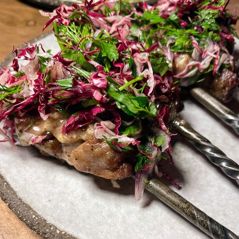 If you only know souvlaki from the excellent album by Slowdive, you can’t have been to Greece where you find it all over the place. Meat grilled on a skewer over charcoal, it’s often served in a pitta with toppings. Here some Iberico pork’s goodness is further enhanced by sweet smoked prunes, almonds and an inspired topping of sour apple and radicchio. Another winner dish.