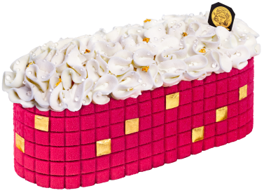 Perfect for a holiday table with its charismatic allure. The indulgence of a chocolate mousse flavoured with the legendary notes of MARCO POLO tea, the smoothness of a pomegranate and raspberry cream, the crunchiness of praline hazelnuts and the lightness of a bourbon vanilla chantilly.